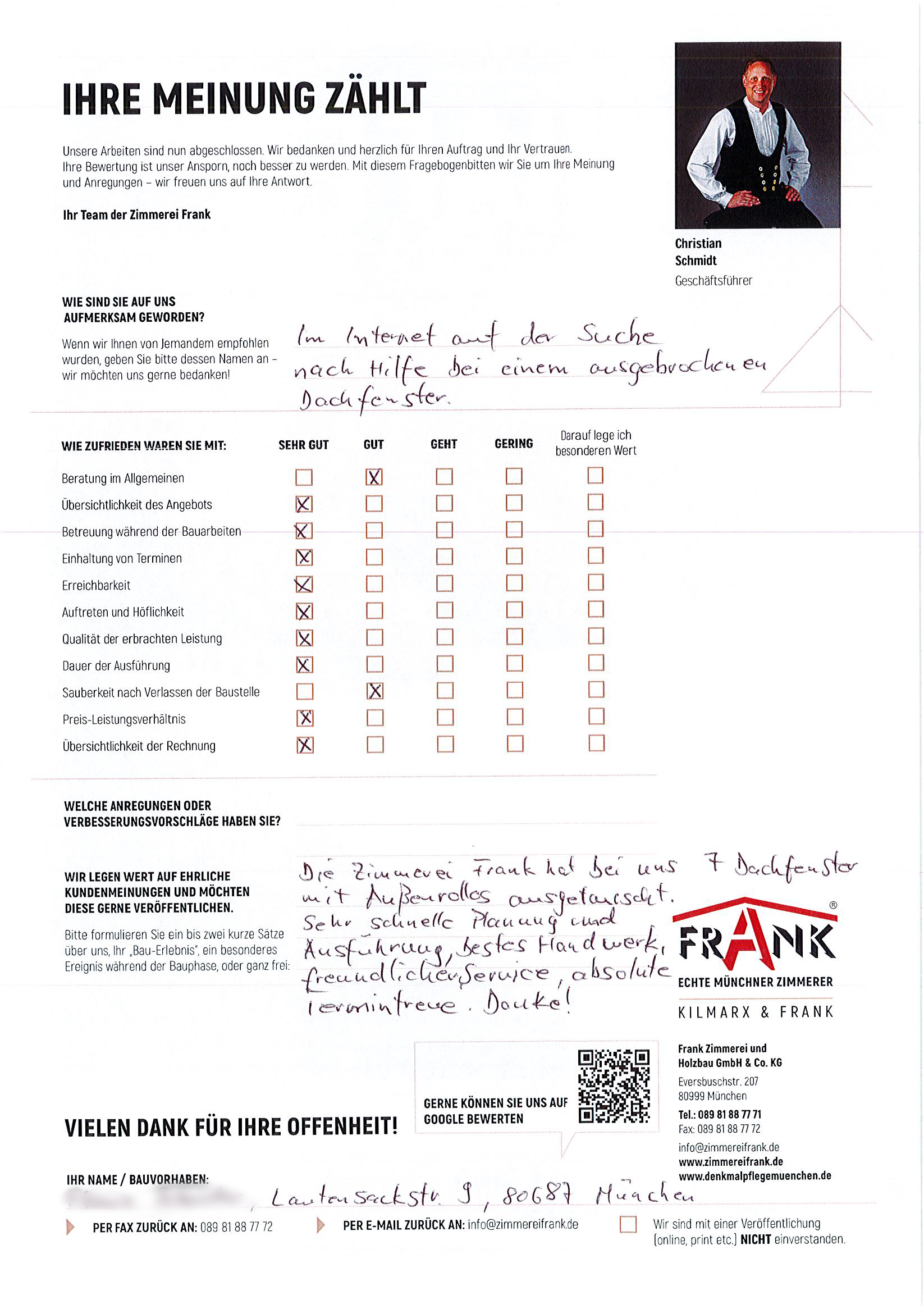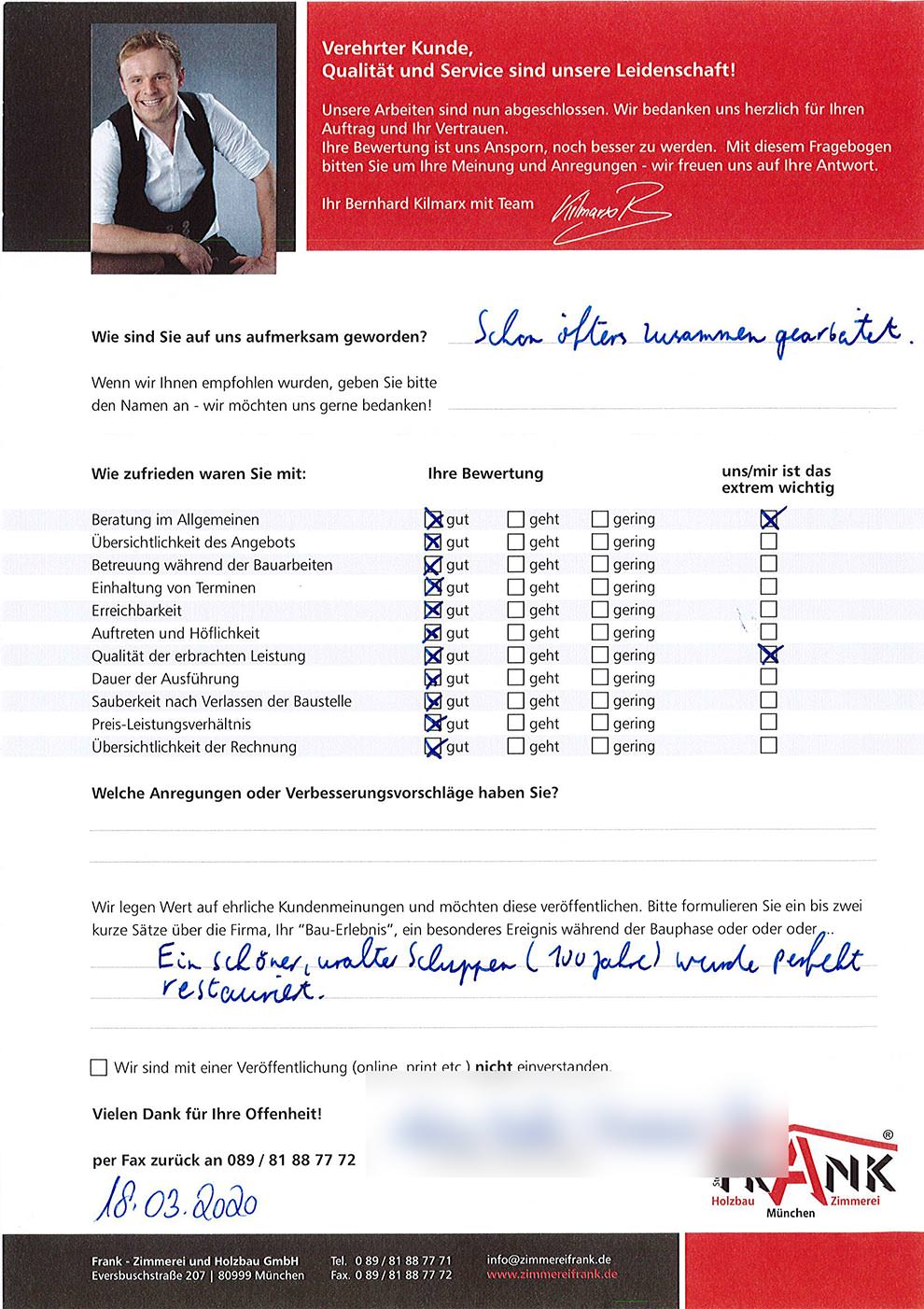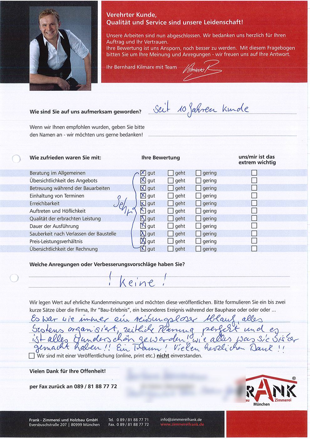 KILMARX-FRANK Zimmerei Muenchen - Blockzitat Anführungszeichen Super Zusammenarbeit mit allen Personen der Zimmerei Frank und allen Nebengewerken KILMARX-FRANK Zimmerei Muenchen - Blockzitat Anführungszeichen