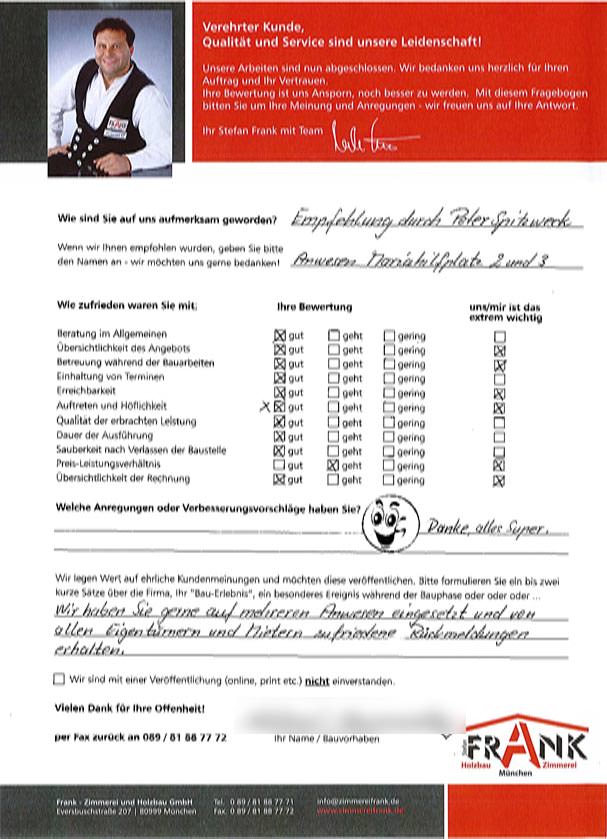 Bauherr: "Frank hört zu, denkt mit, plant vorausschauend und realisiert reibungslos." Das wird auf der Website versprochen und wurde bei unserem Bauprojekt Neubau Dachgeschoss inkl. zweier Dachgauben und PV-Anlage (DHH) uneingeschränkt bestätigt. Es war die beste Entscheidung, unser Bauprojekt der Firma Frank anzuvertrauen. Herzlichen Dank an Herrn Christian Schmidt für die ausgezeichnete, einwandfreie und unkomplizierte Koordination, an Herrn Bogenrieder und Herrn Neuling für die perfekt durchdachte Bauplanung und last but not least an den klasse Zimmermannstrupp rund um Herrn Keil samt Sondereinsatz um 22 Uhr (Abdichten des Dachstuhls bei Starkregen). Wir sind rundum zufrieden!