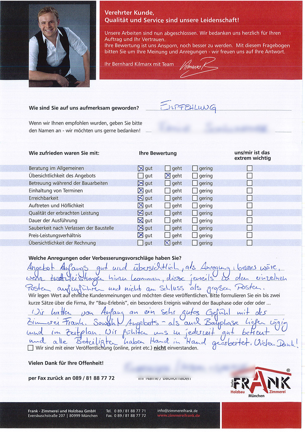 KILMARX-FRANK Zimmerei Muenchen - Blockzitat Anführungszeichen Habe noch nie eine so kompetente, freundliche und geduldige Beratung und Betreuung vor, während und nach der Bauphase erlebt. KILMARX-FRANK Zimmerei Muenchen - Blockzitat Anführungszeichen