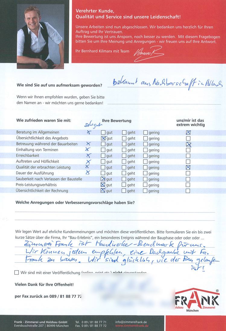 KILMARX-FRANK Zimmerei Muenchen - Blockzitat Anführungszeichen Wir können jedem empfehlen eine Dachgaube mit der Zimmerei Frank zu bauen. KILMARX-FRANK Zimmerei Muenchen - Blockzitat Anführungszeichen
