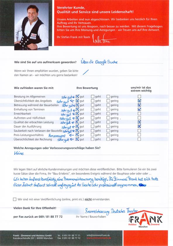 KILMARX-FRANK Zimmerei Muenchen - Blockzitat Anführungszeichen Deutsches Theater: Die Zimmerei Frank war äußerst schnell, engagiert und professionell! KILMARX-FRANK Zimmerei Muenchen - Blockzitat Anführungszeichen